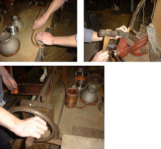 という訳で今回もやはり手を使います。親指のカーブに添わせながら指の力で曲げていきます。そうすると自然の曲がりに近い仕上がりとなるのです。指の力で曲がらない太い管などは、望みのカーブを持った円筒に管の片側を固定し、てこを利用しながら曲げていきます。