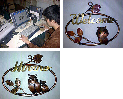 そして、コンピューターにそのアウトラインを入力し、裁断機にデータを送ると言うわけです。出来た作品は手描きのアウトラインを保ったままフクロウたちと違和感なく融和されるのです。