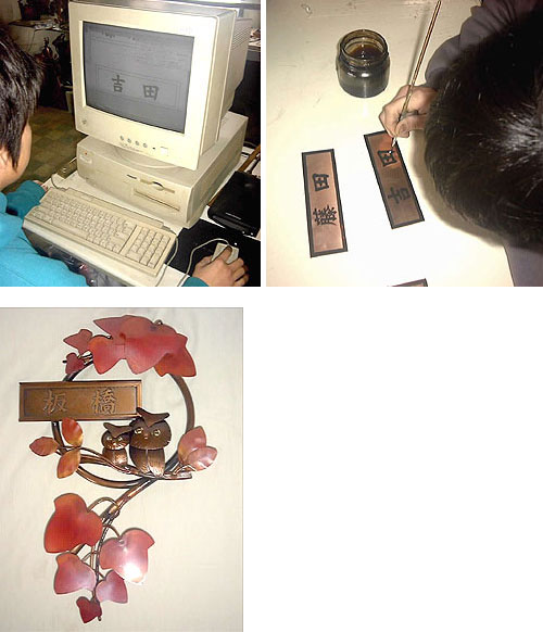 まず、パソコンでベースとなる銅板の大きさに合わせて、書体を選び文字を入力します。そのままではバランスが悪いため、文字の大きさ、太さ、傾き等を調節します。銅板で仕上げた時にどうなるかを想定しながら作業を進めていきます。パソコンを使う以前は1ヶ1ヶレタリングしていたので文字列ができるまでに大きな手間がかかっていました。今でもお客様によっては完全な手書き文字や、マーク、会社のロゴ等様々な注文をいただきますので、パソコン使わず、全て手書きで行うこともよくあります。