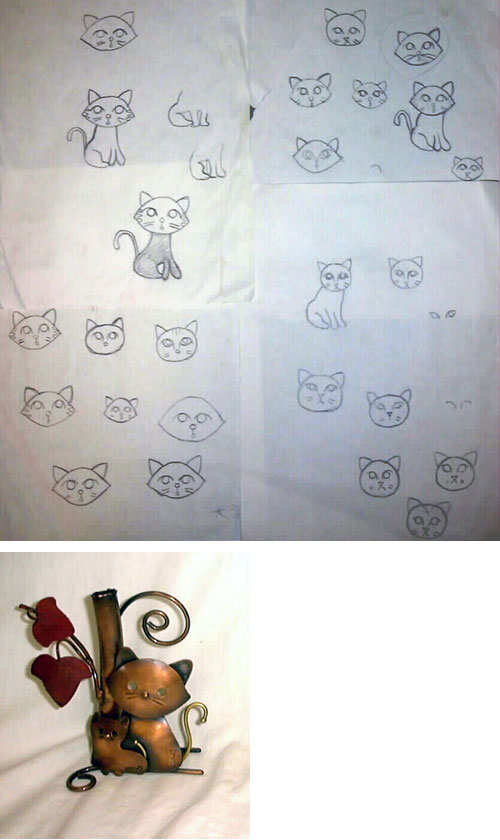 やはり、新しいモノを創造するってことは、エキサイティングでとてもワクワクすることなんです。でも、銅板を使って形にするまでには、形になった時を想像しながら、写真のようにたくさんのスケッチを行い、紙の上で試行錯誤をくり返します。アウトラインが1ミリずれただけで、表情ががらりと変わってしまうということもあるので、紙の上でぎりぎりまでデザインを行うのです。