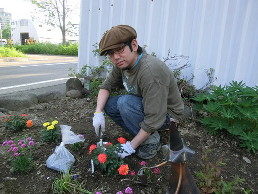 ん?おいおい、朝から変質者か?通報しなきゃ!と思いきや、いやいや違います、彼こそは定山渓アトリエのお花畑実行委員のK氏でした!