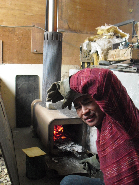 今回のストーブは奥の土間に設置されました。雰囲気もいい感じで点火すると蒔きストーブのいい匂いが漂います。早速嬉しそうに準備するK氏。大はしゃぎです!