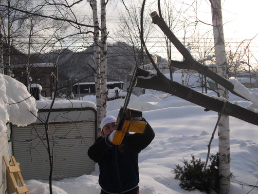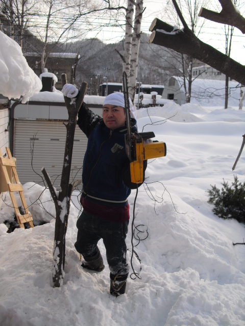 とりあえずこの寒さ対策は何とかなりそうだと思っていた矢先!なんと先日リフォームしたばかりの屋根に隣の土地の大木が雪の重みで倒れて直撃!!幸い、屋根の雪がクッションになりダメージは少なかったですがとにかくこの枝を何とかしなきゃと思いきや、既にそこにはK氏がホラー映画風にチェンソーを持って大格闘! 頼もしい限りです!