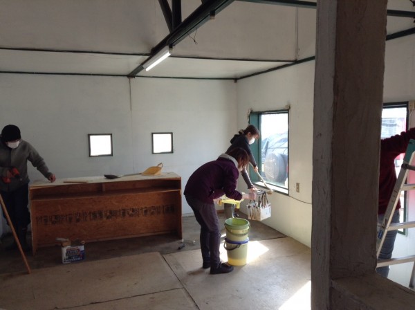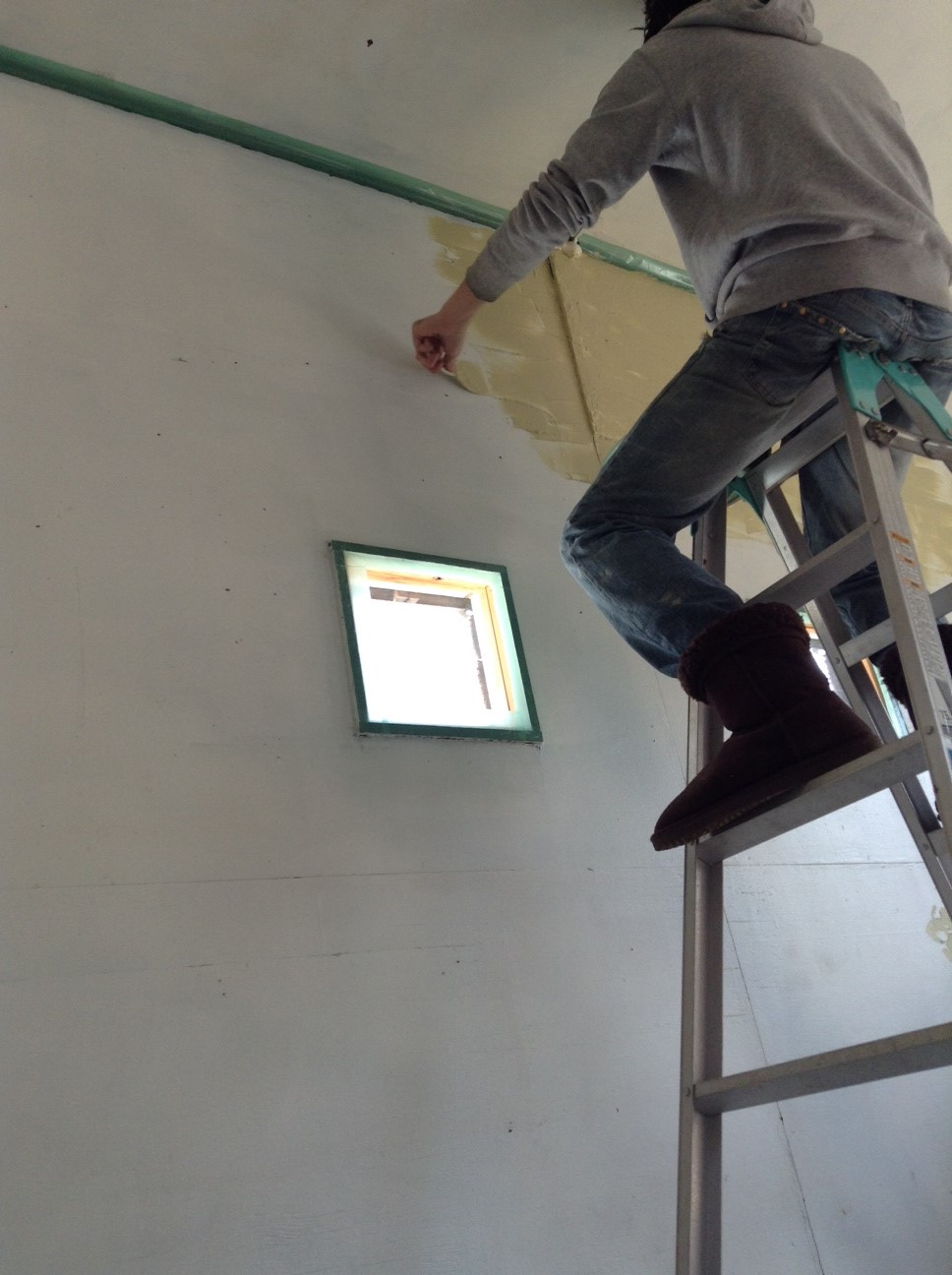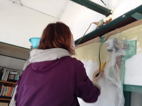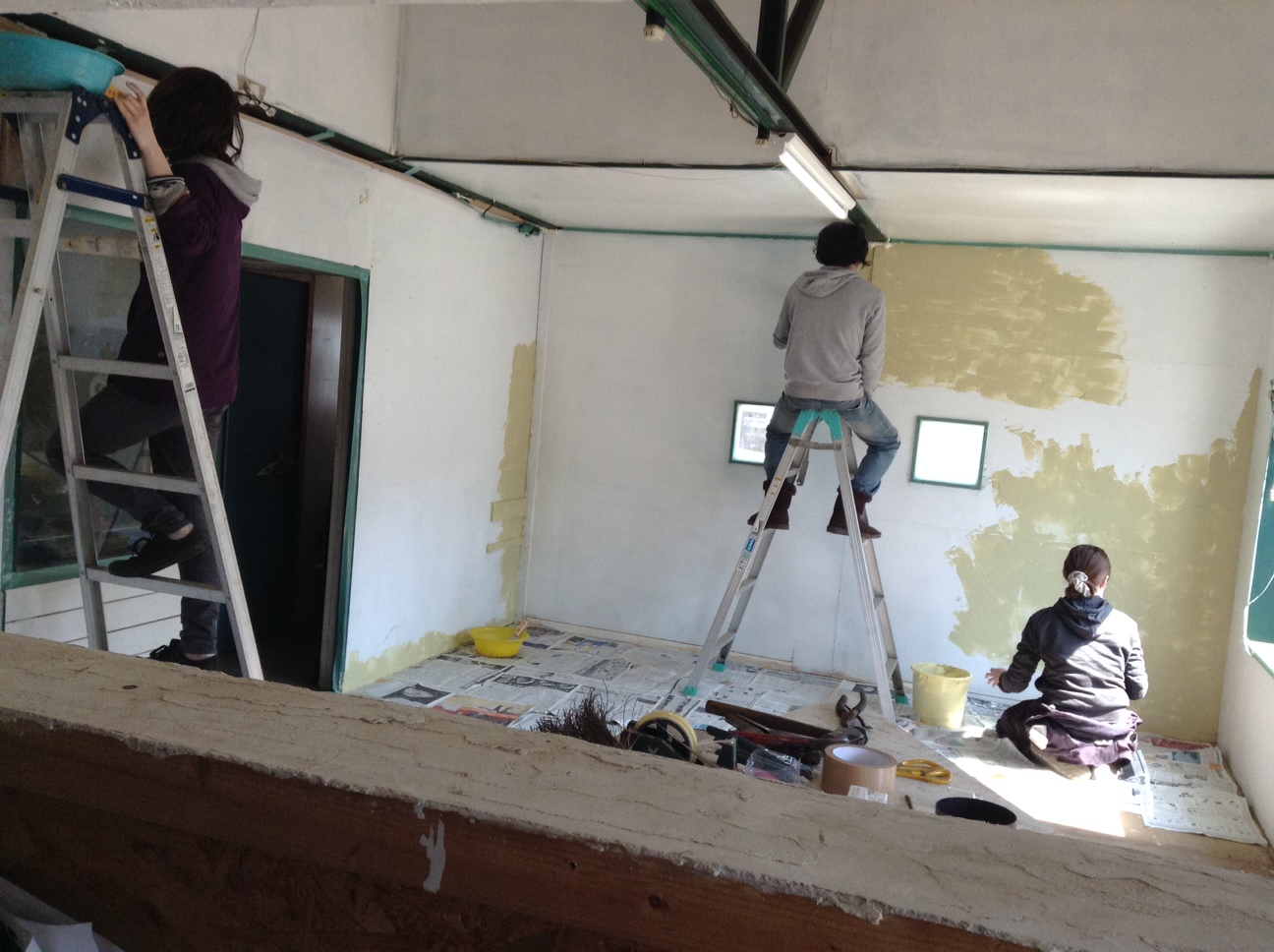 床はむき出しの板に直接塗料を塗り、ニスで仕上げます。