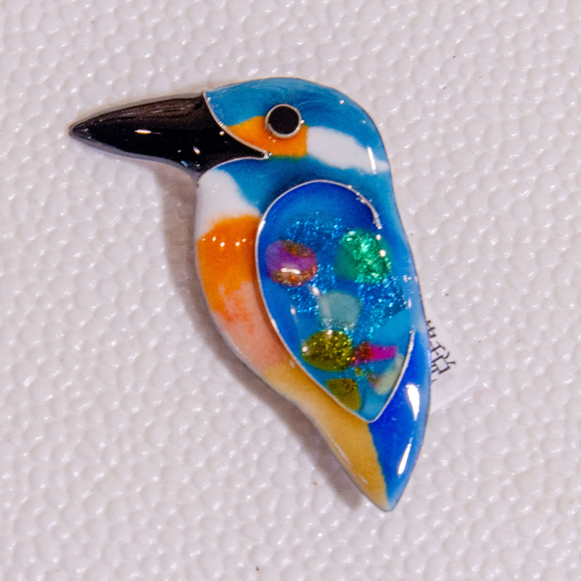 カワセミ(翡翠)の羽色が七宝焼の美しい青で表現されています。