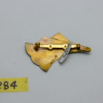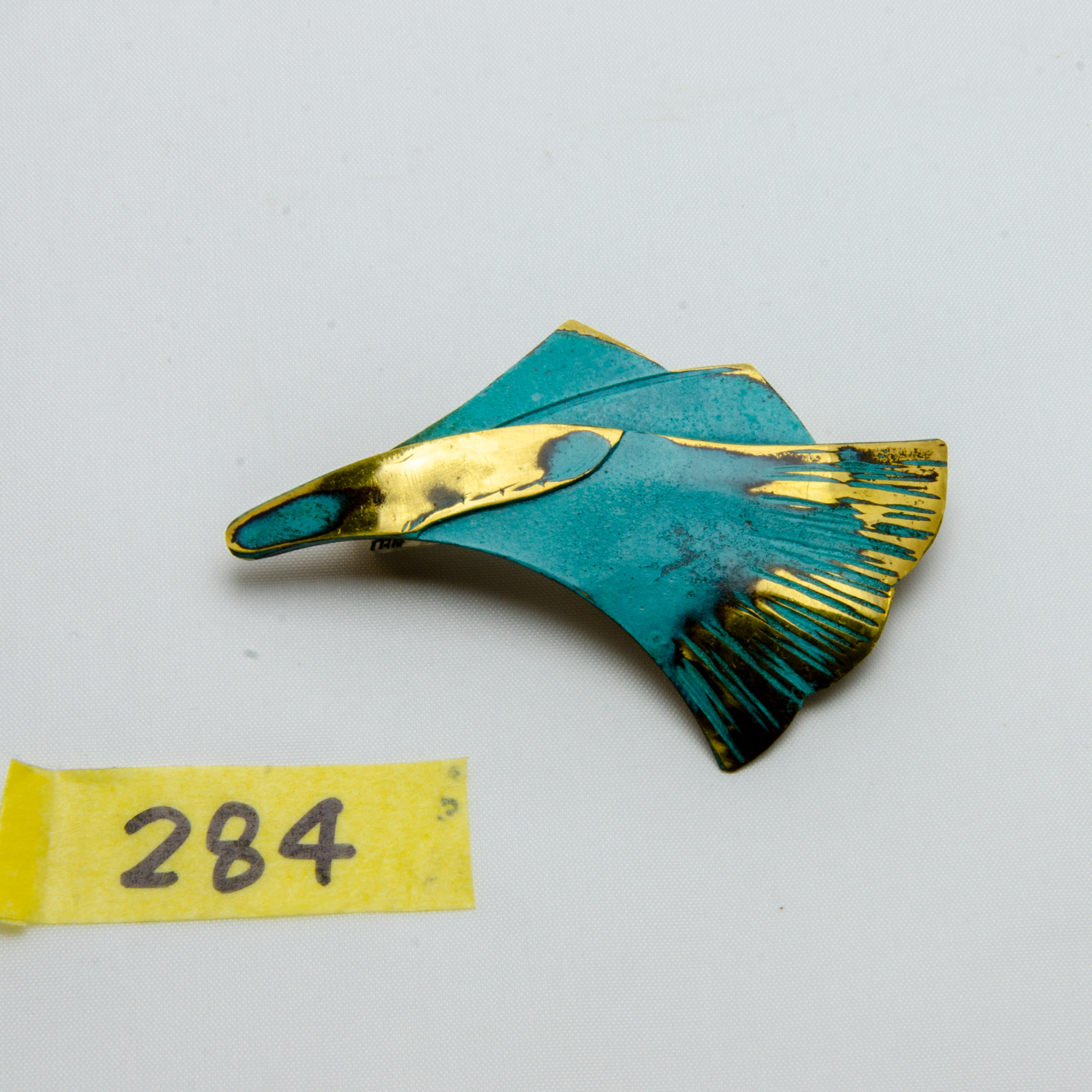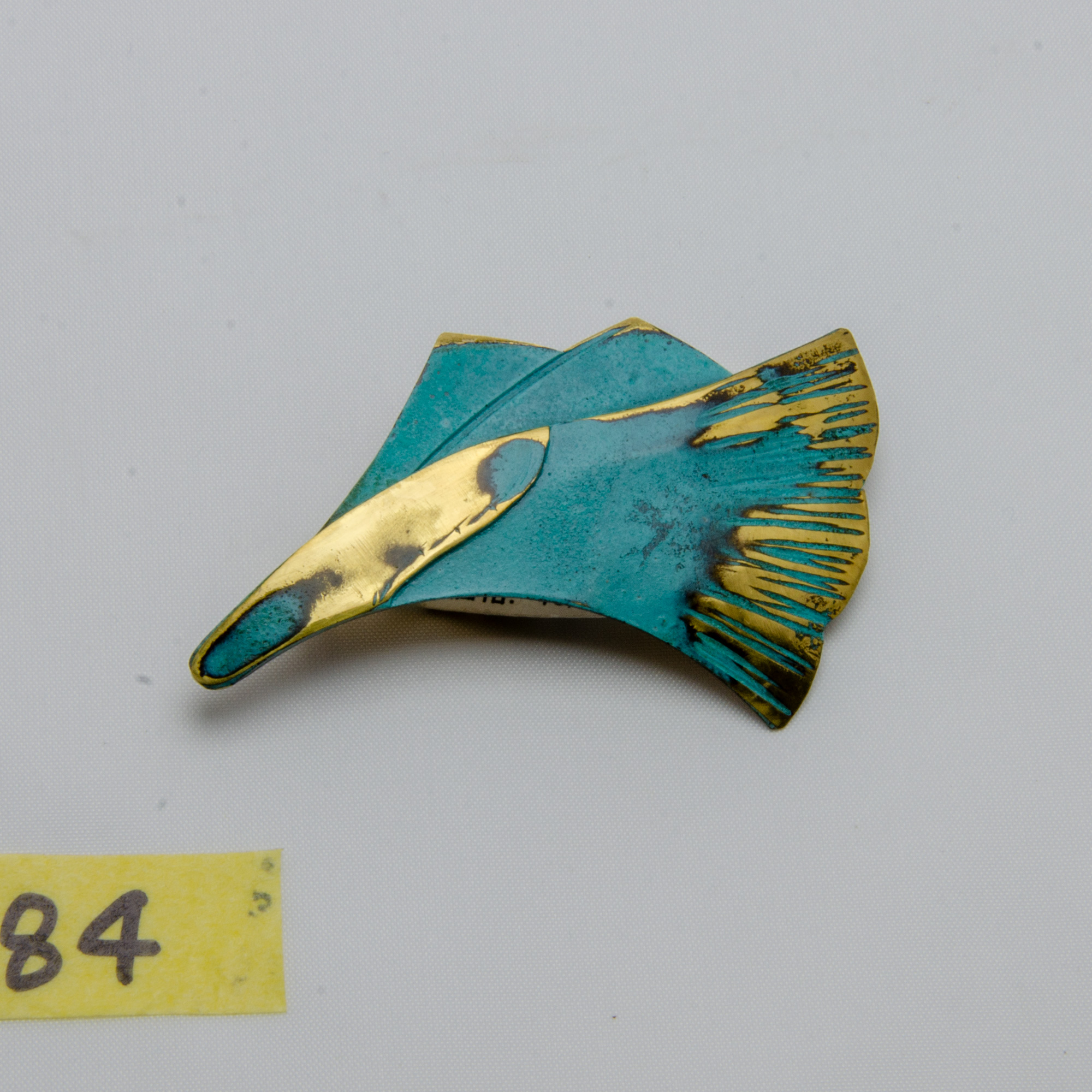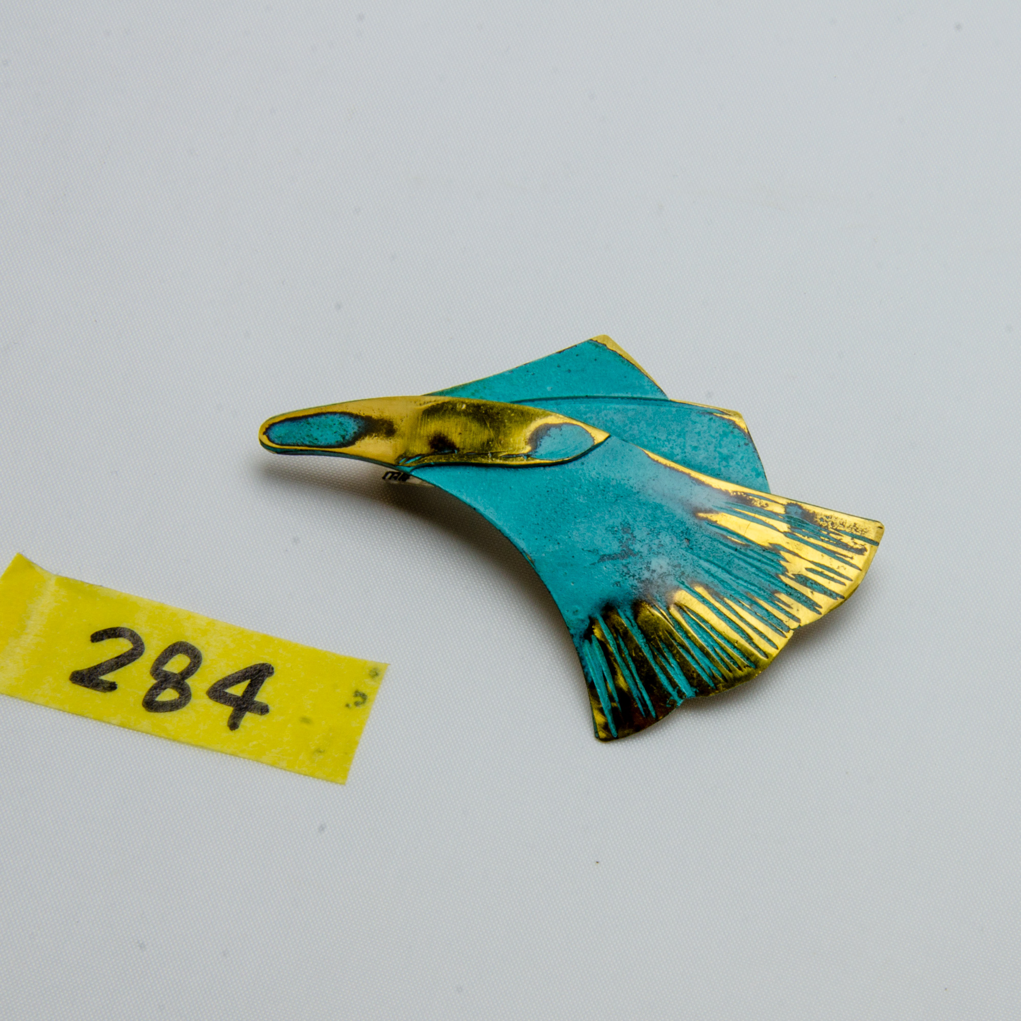 鮮やかな緑青の青色と真鍮の金色のコントラストが美しいブローチです。 目を引く上品な色合いは白や黒のお洋服によく映えます。 緑青は表面の皮膜であるため変色はほぼ無く、内部腐食を防ぐ効果があります。