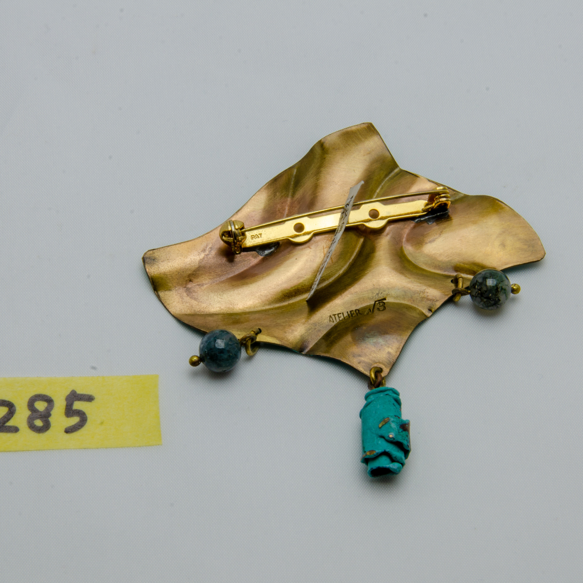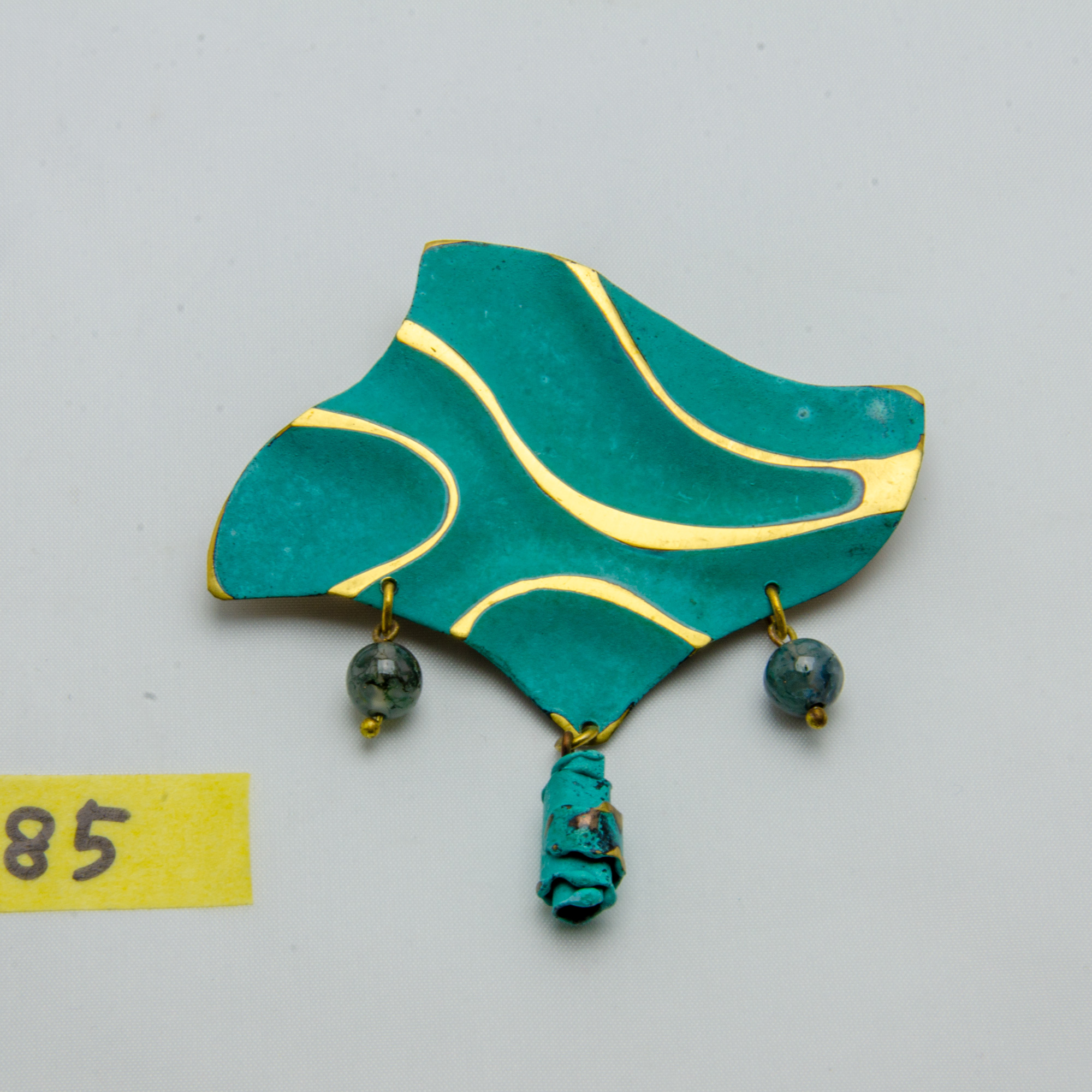 鮮やかな緑青の青色と真鍮の金色のコントラストが美しいブローチです。 大振りなのでコートにも合わせることができます。 くるくると巻いた立体的なパーツと天然石がゆらゆらと揺れるアクセントになっています。