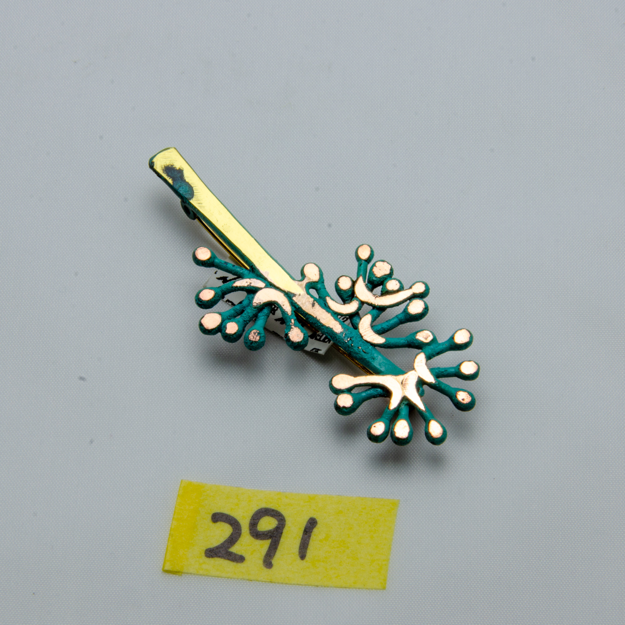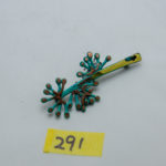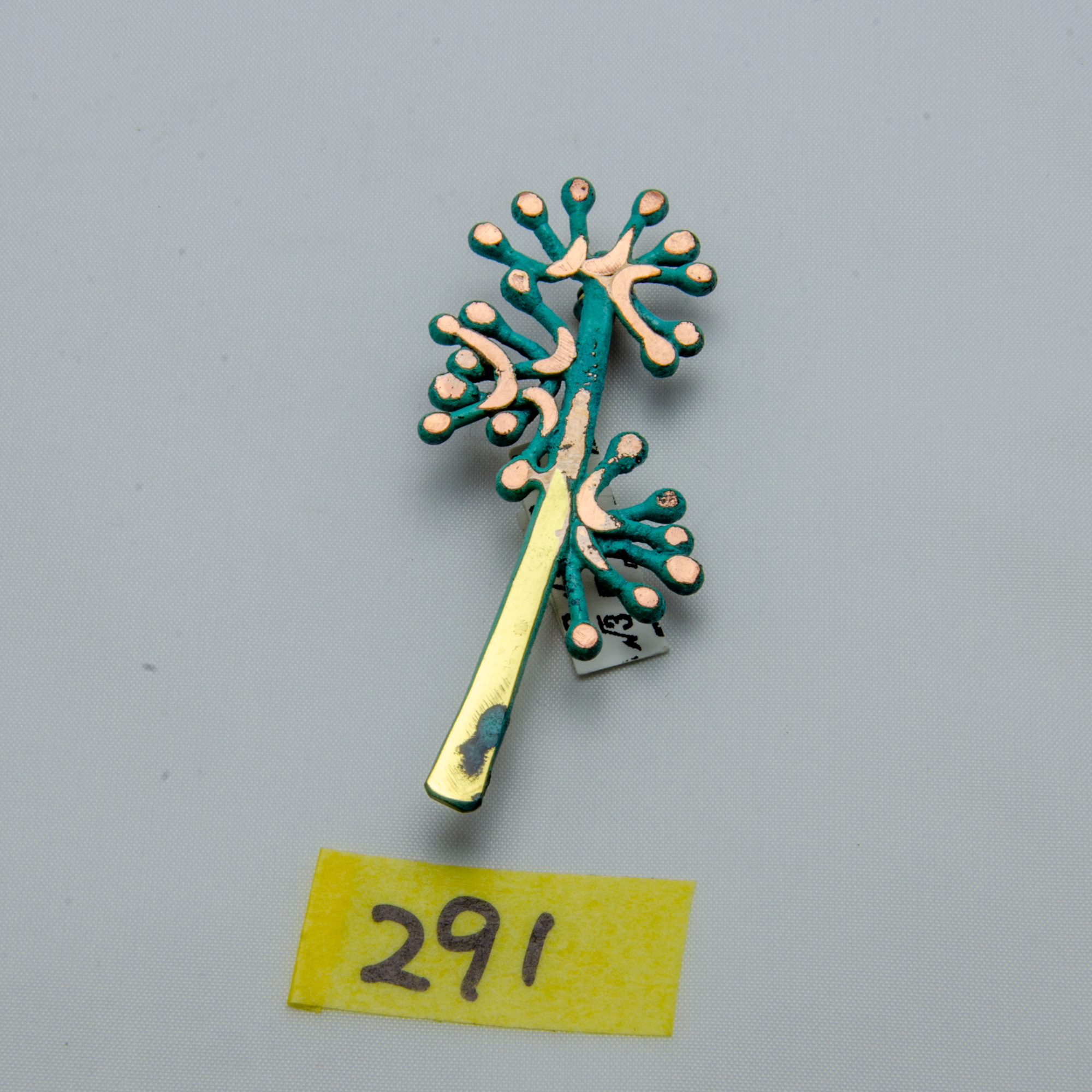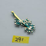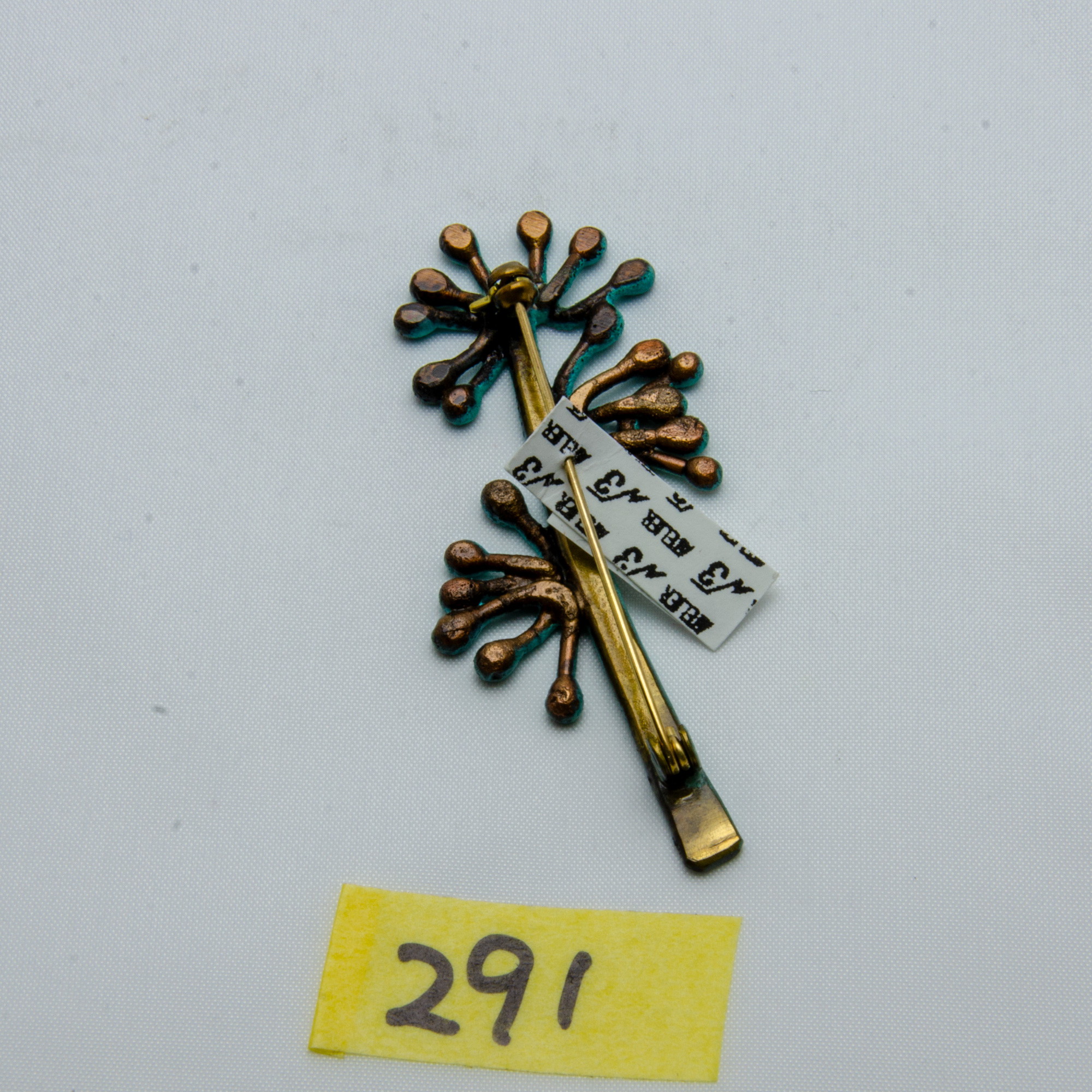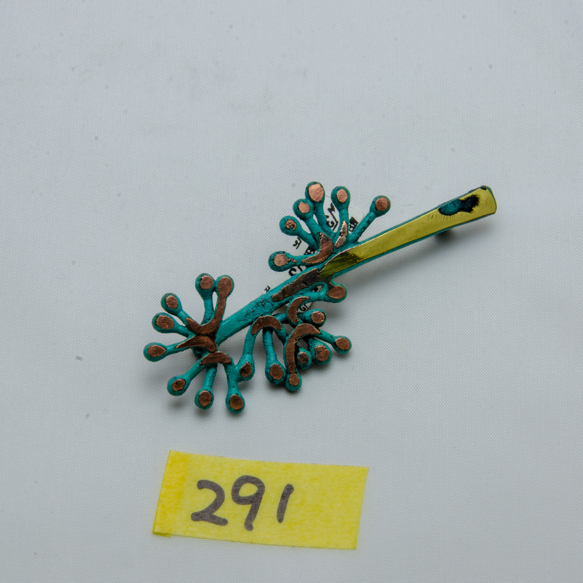 鮮やかな緑青の青色と真鍮の金色のコントラストが美しいブローチです。