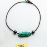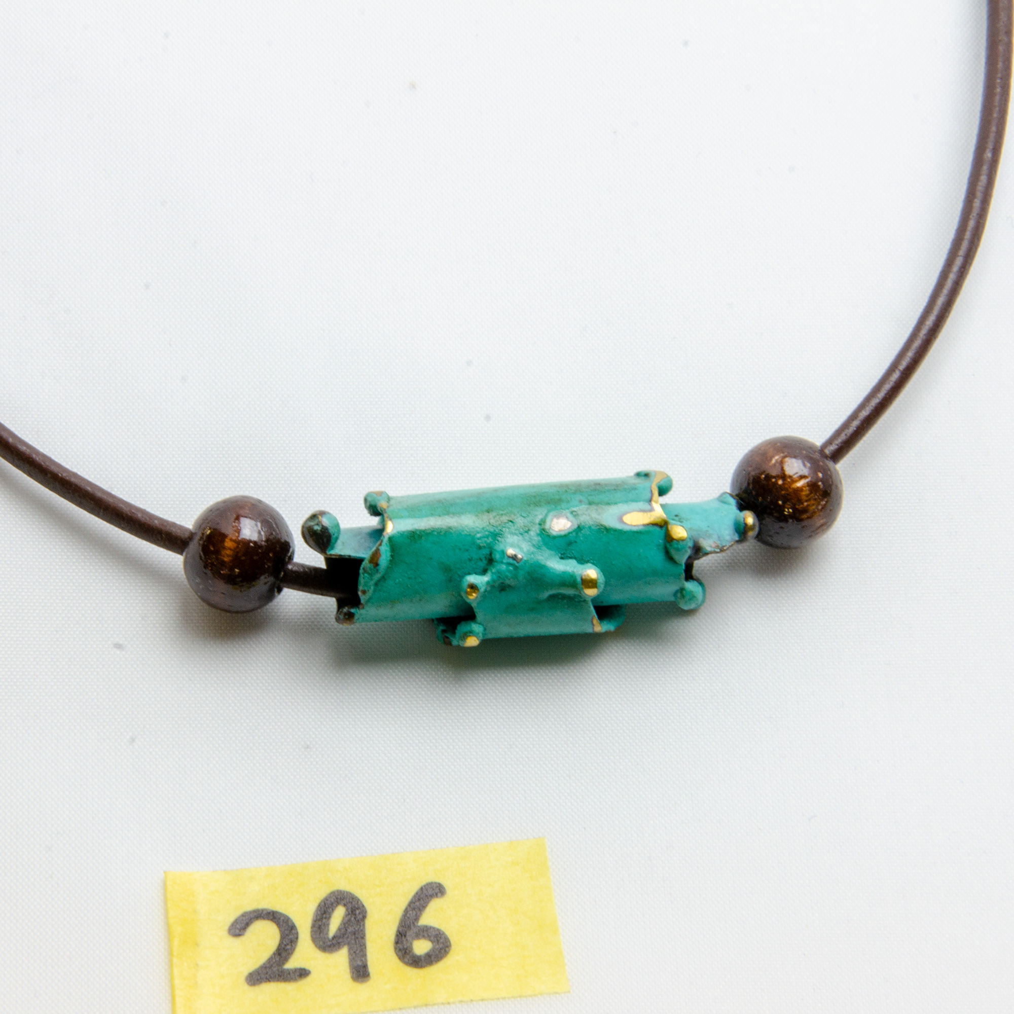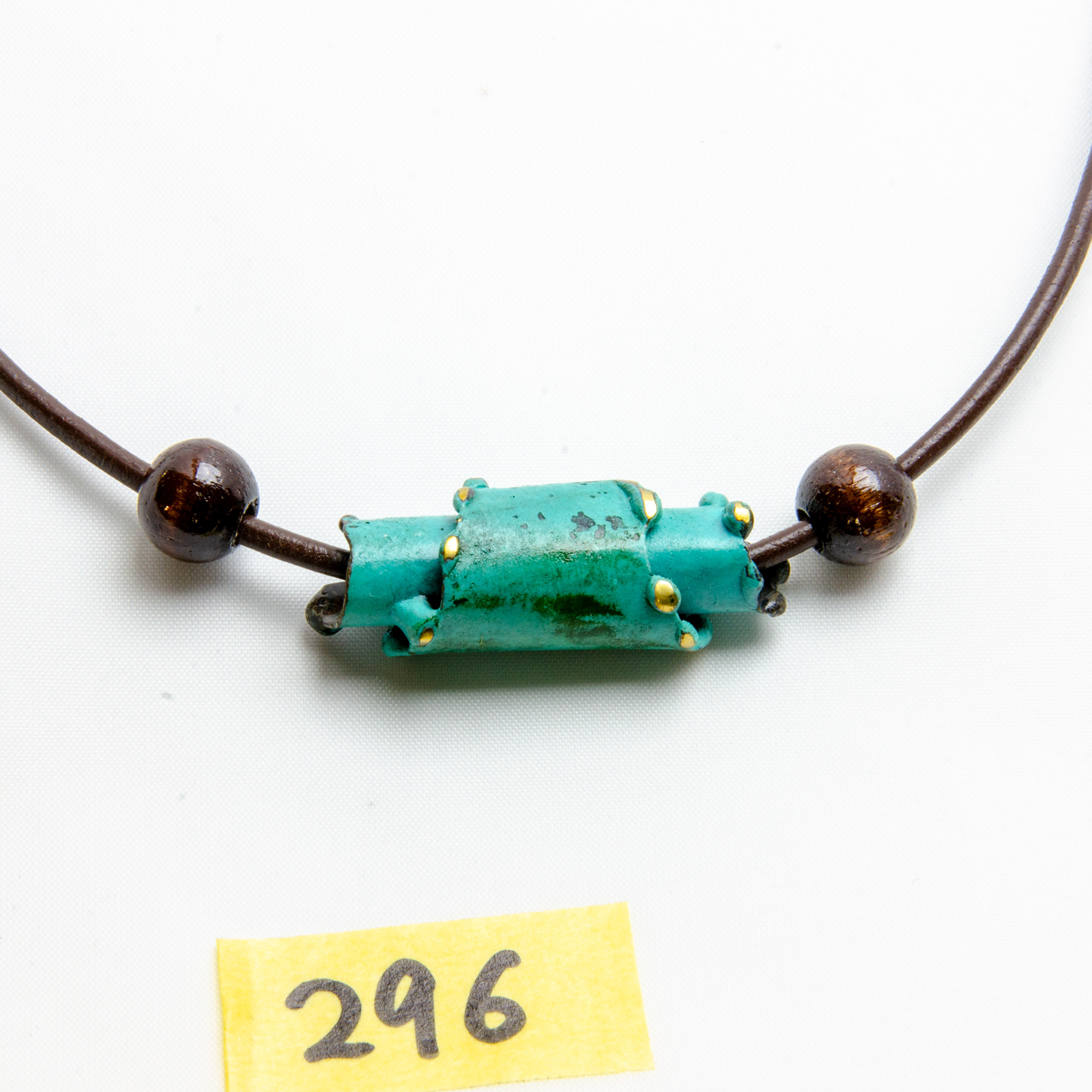 真鍮の表面を緑青仕上げという技法で青く仕上げたペンダントです。シンプルなデザインで色々なファッションに合わせやすいです。