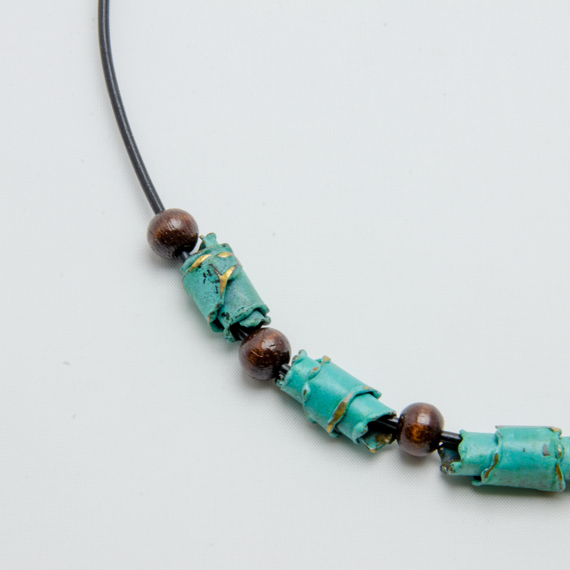 真鍮の表面を緑青仕上げという技法で青く仕上げたペンダントです。シンプルなデザインで色々なファッションに合わせやすいです。