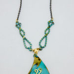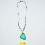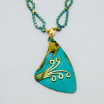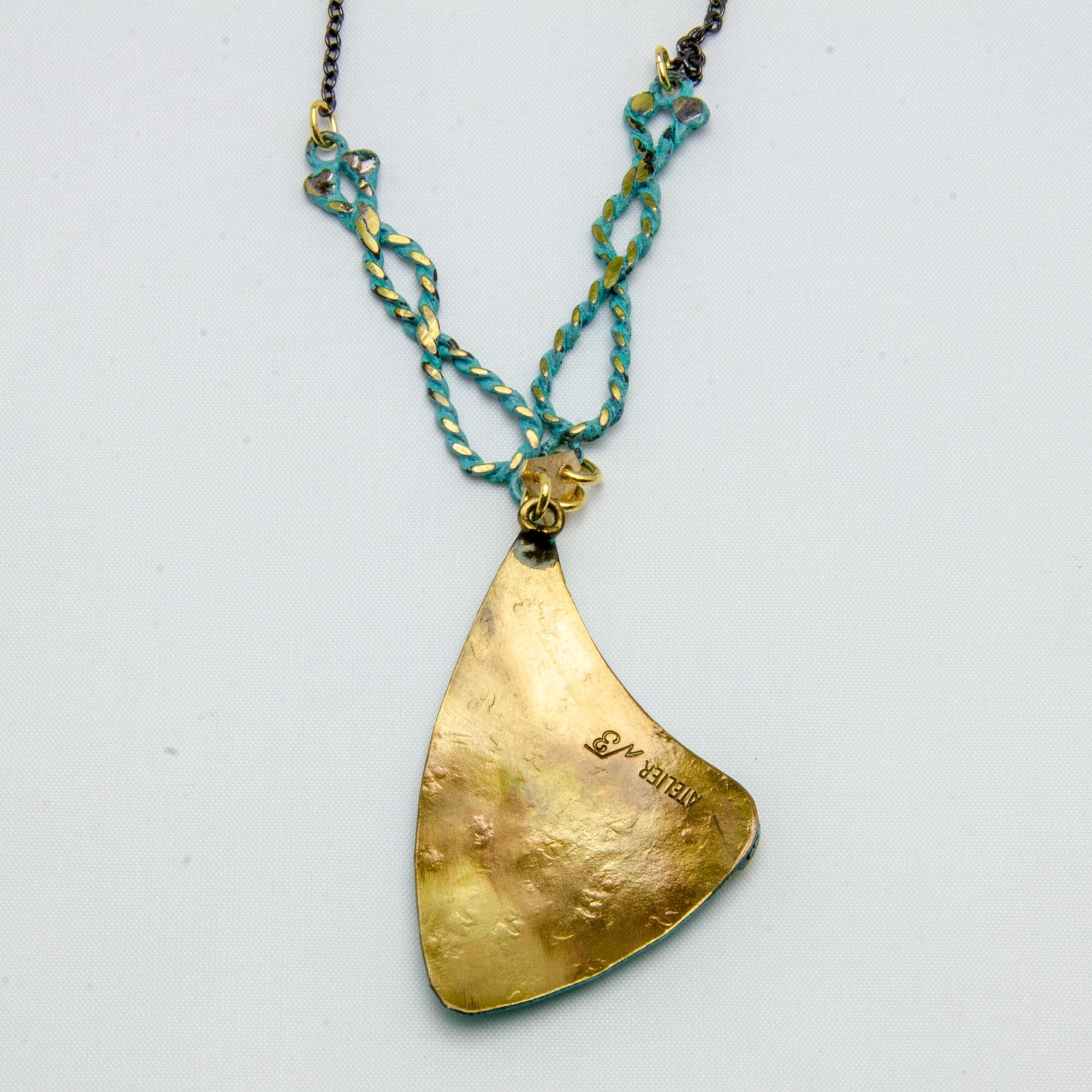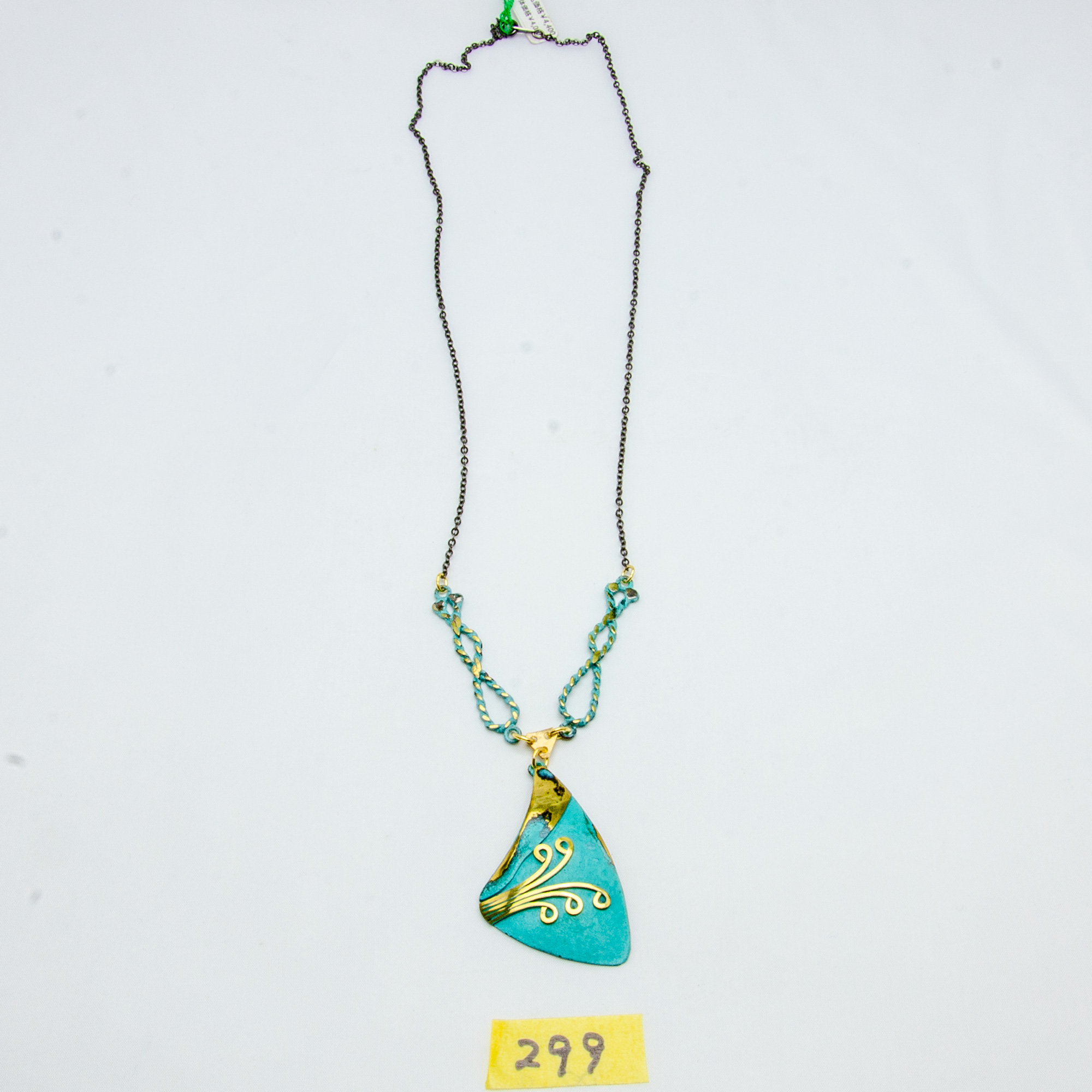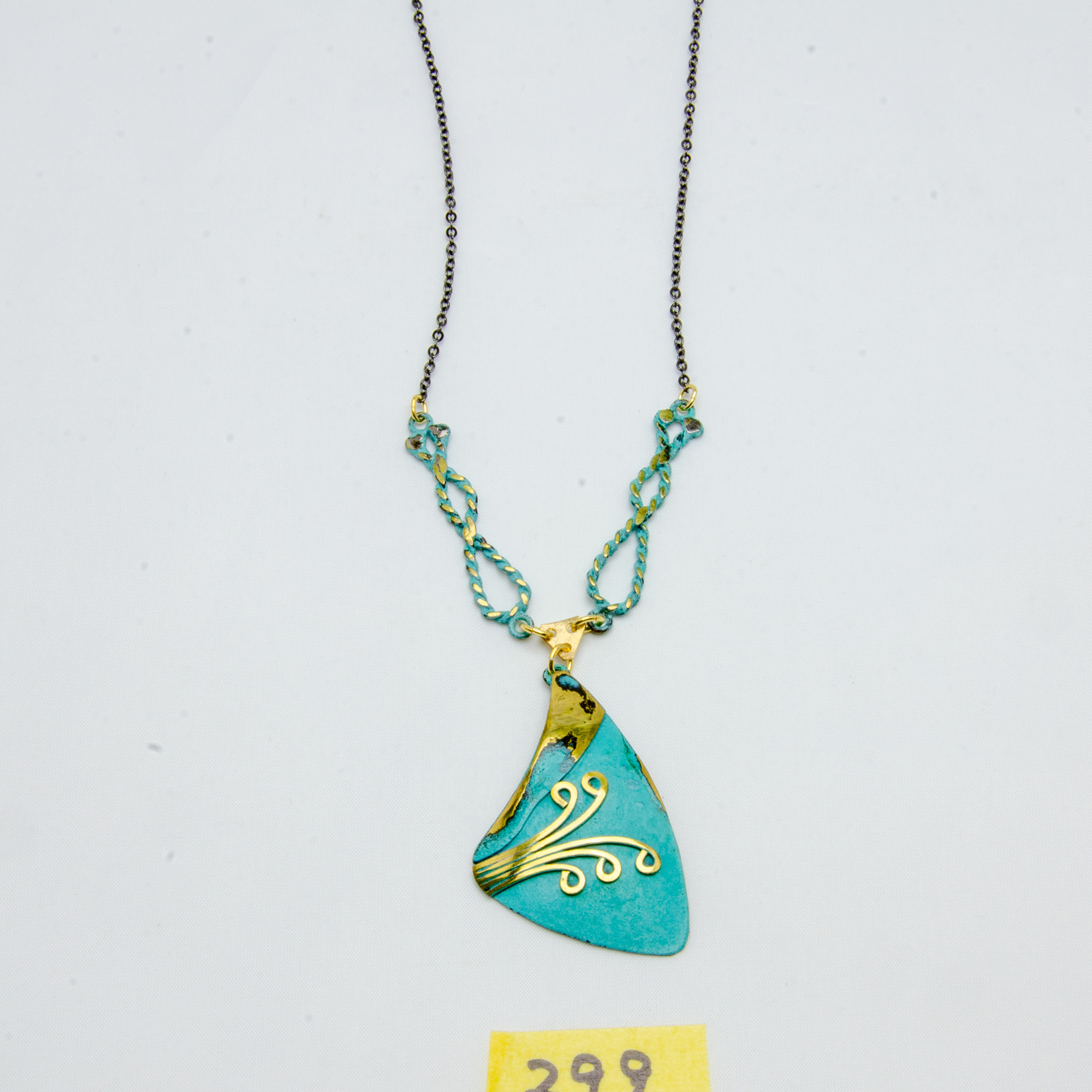 真鍮の表面を緑青仕上げという技法で青く仕上げたペンダントです。トップの装飾が個性的なデザインです。
