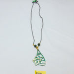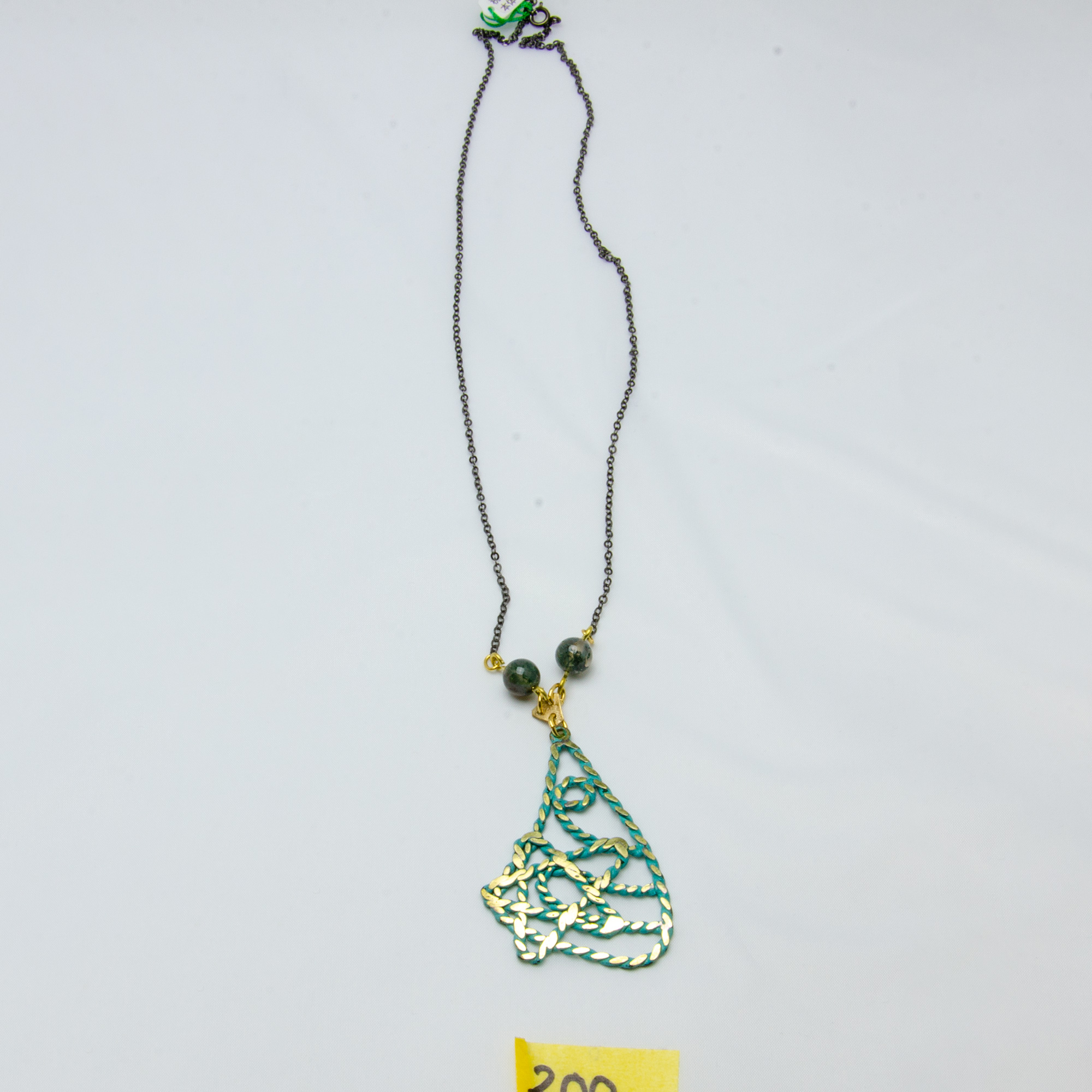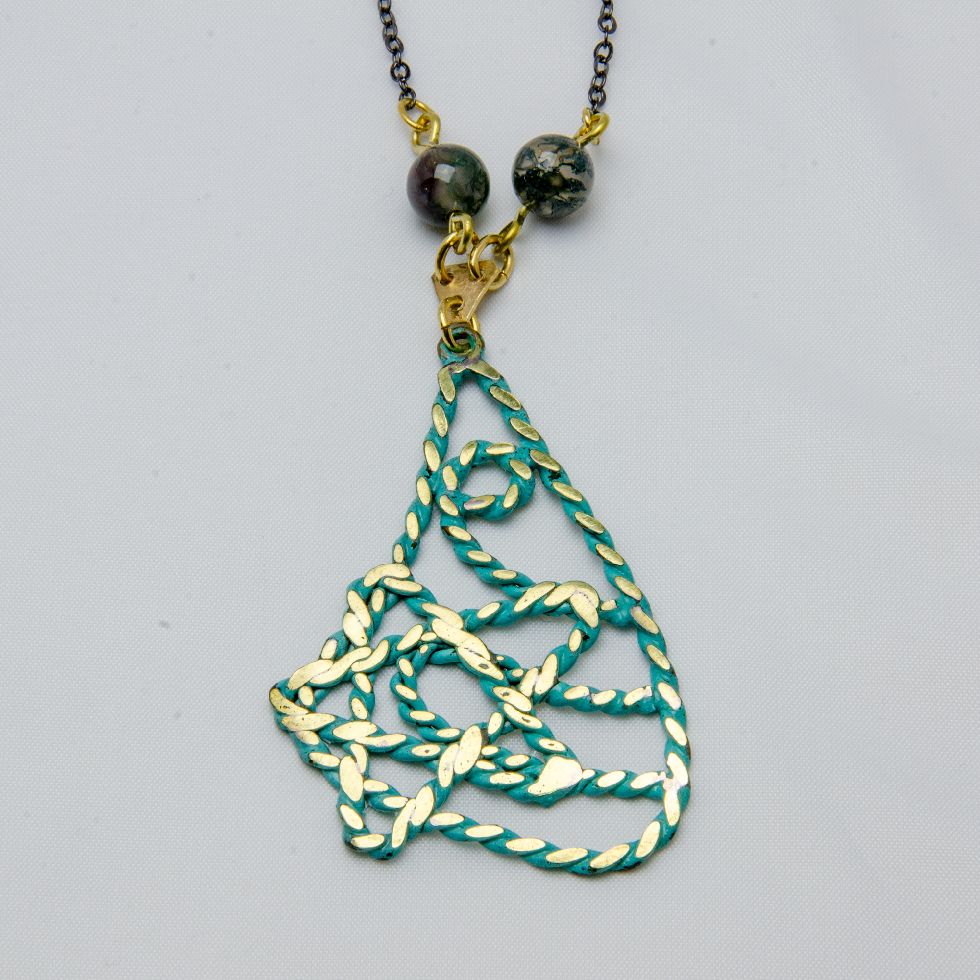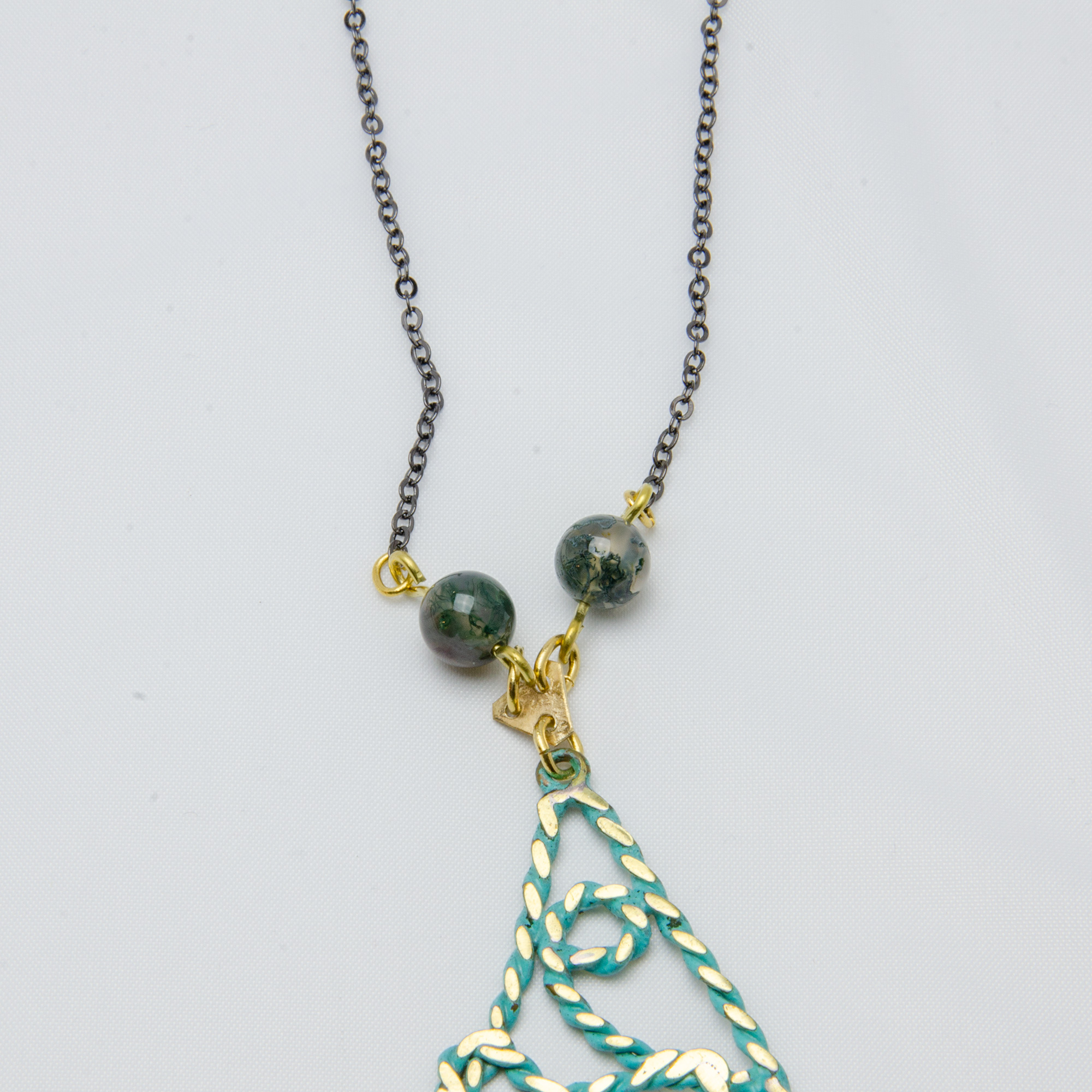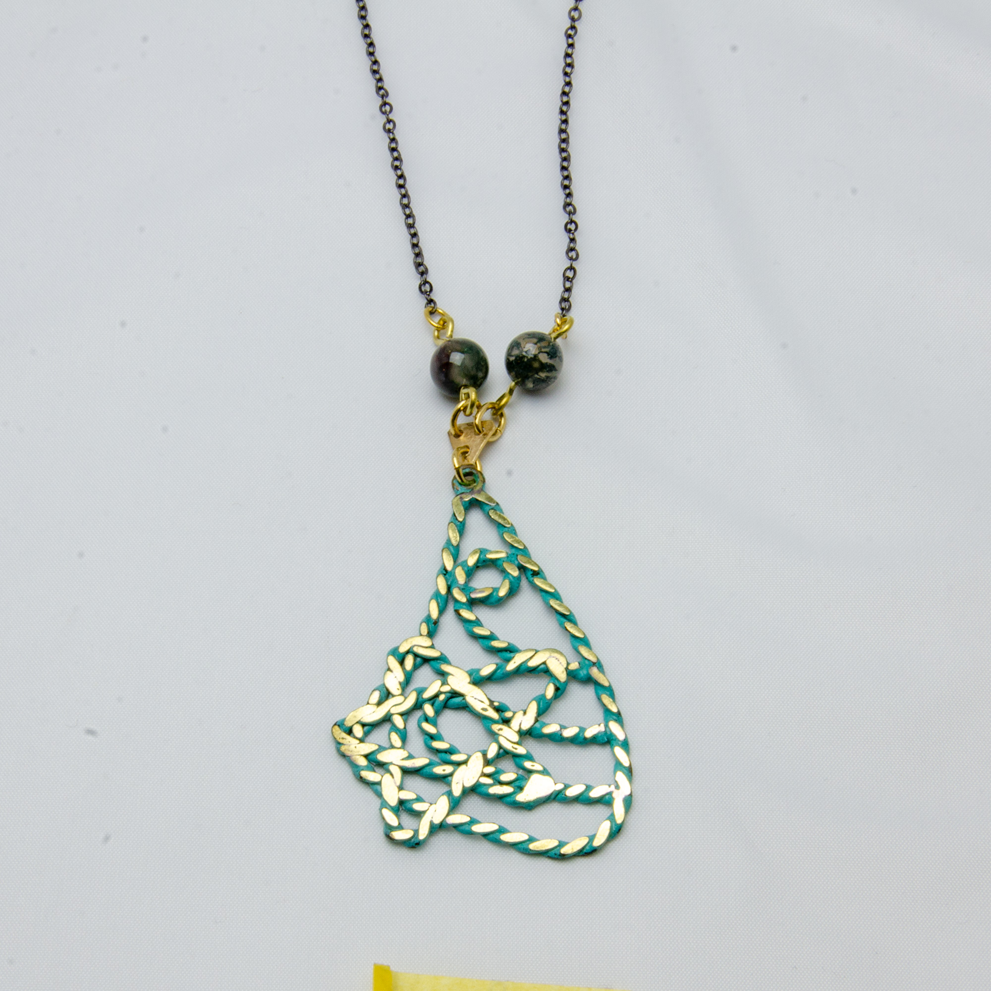 真鍮の表面を緑青仕上げという技法で青く仕上げたペンダントです。トップの装飾が個性的なデザインです。