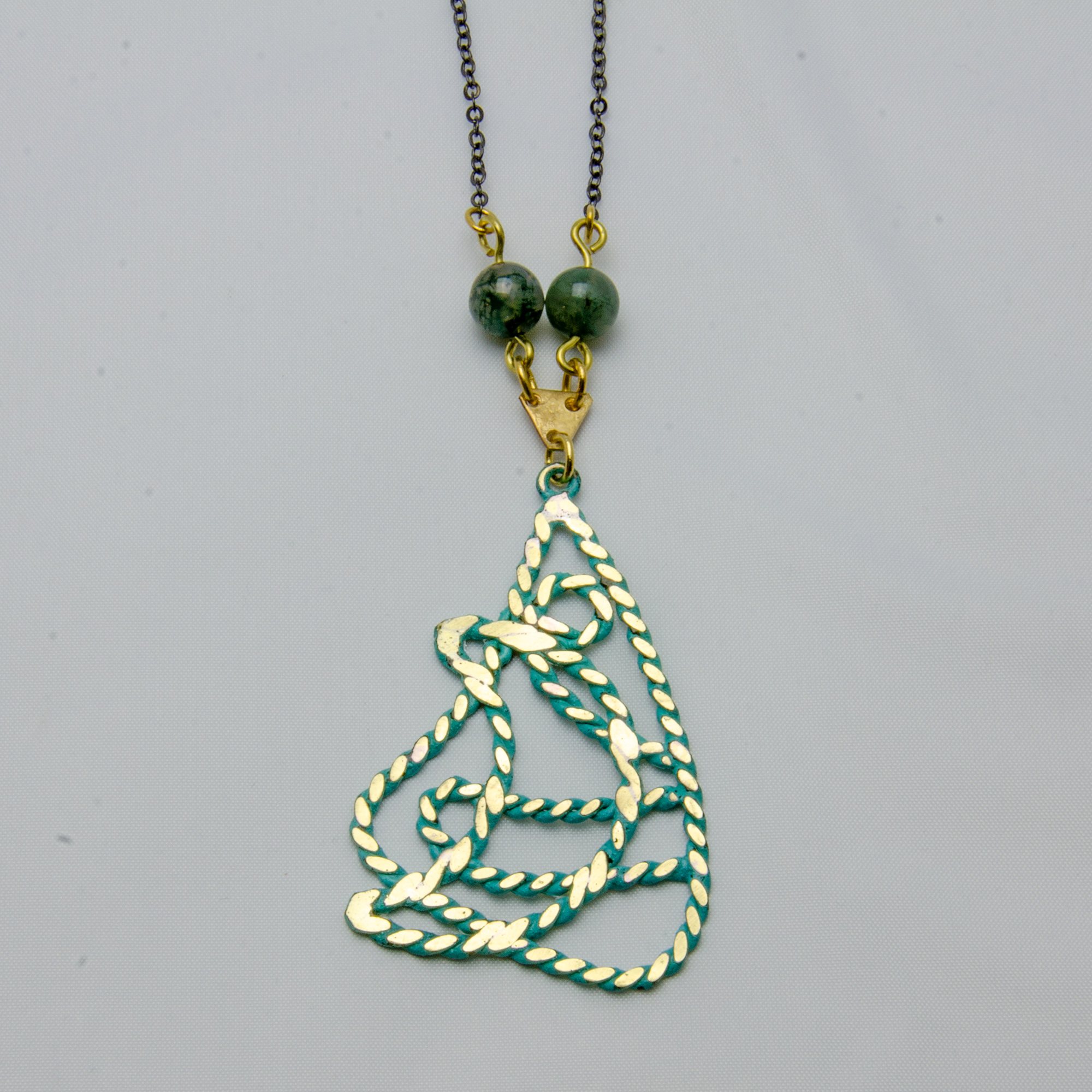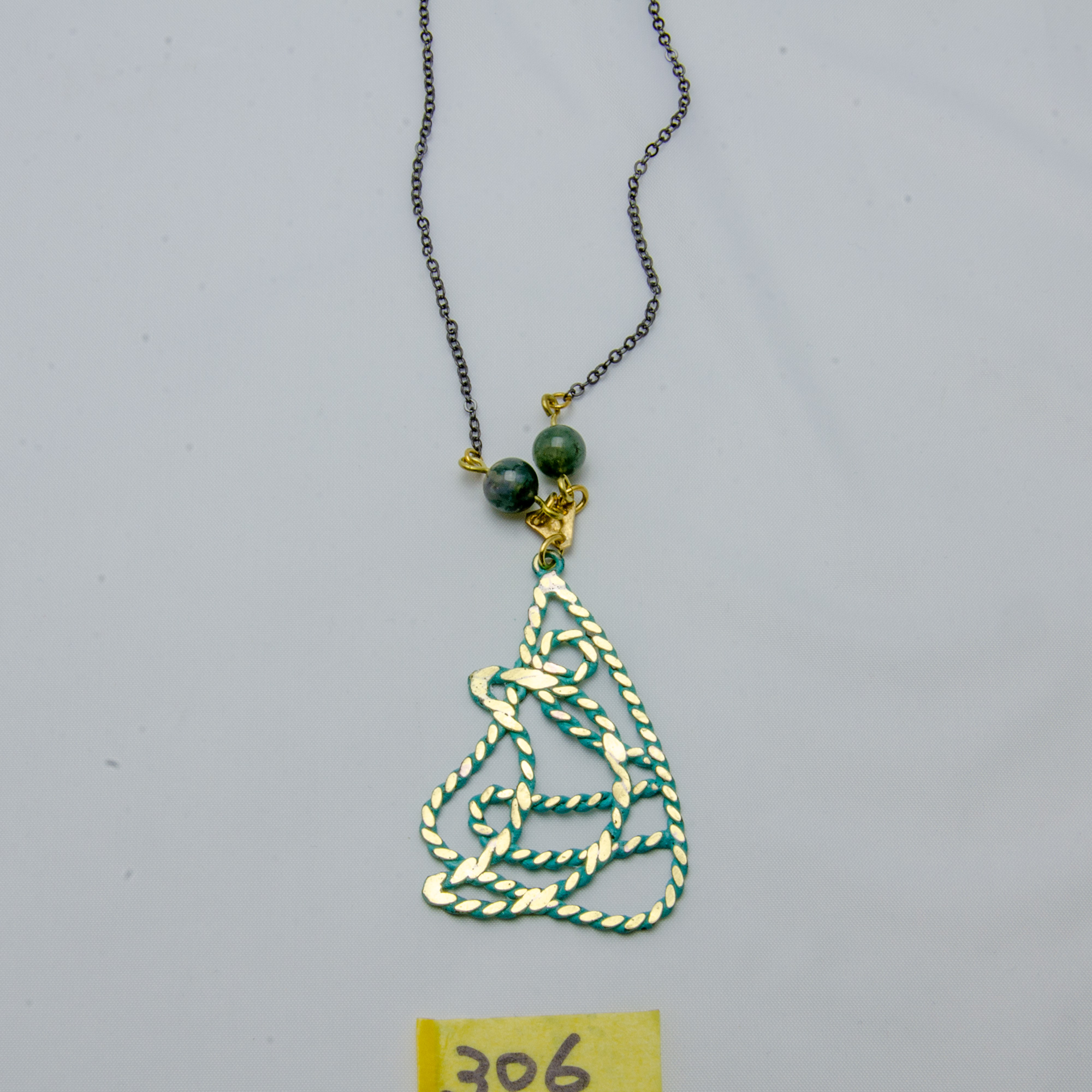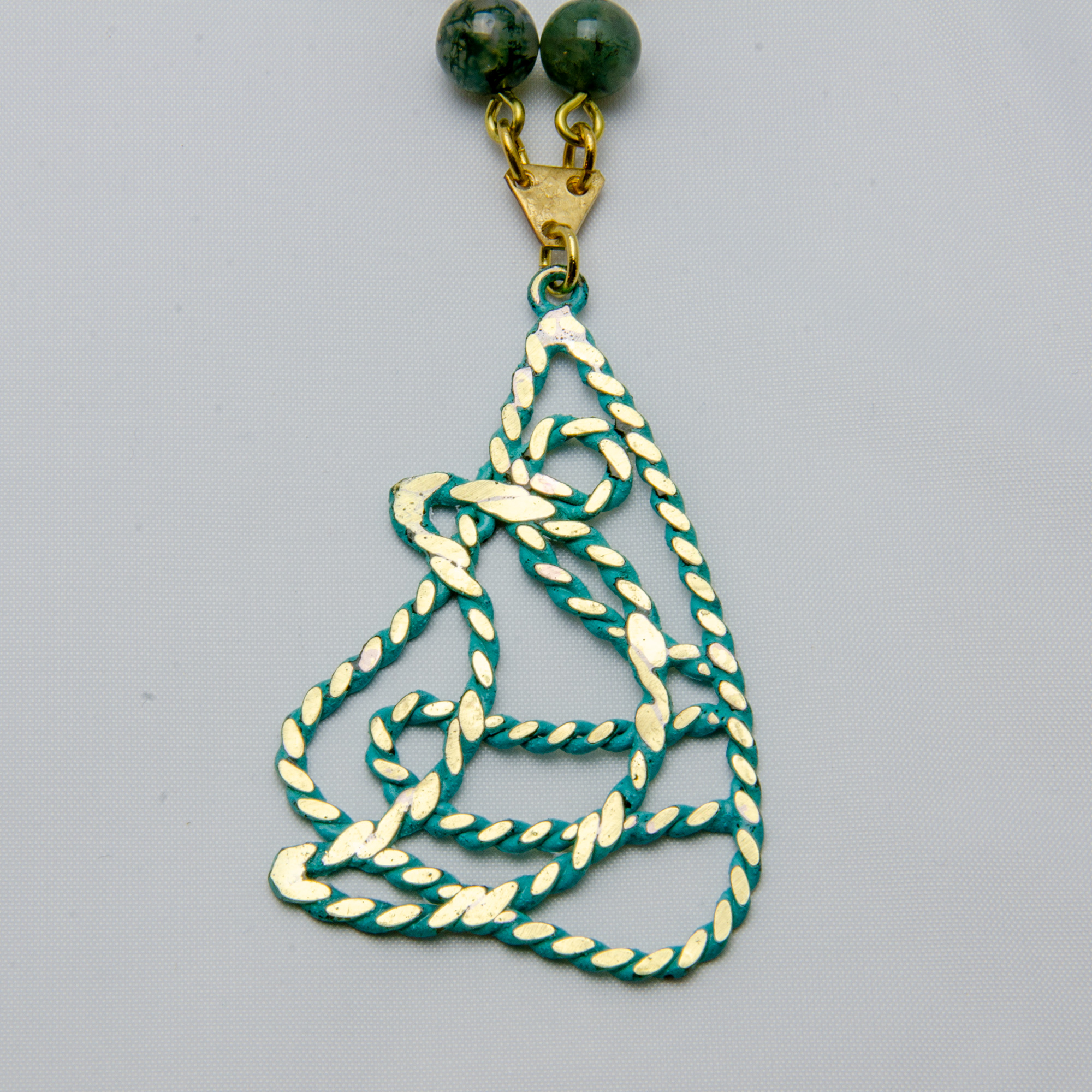 真鍮の表面を緑青仕上げという技法で青く仕上げたペンダントです。トップの装飾が個性的なデザインです。