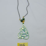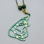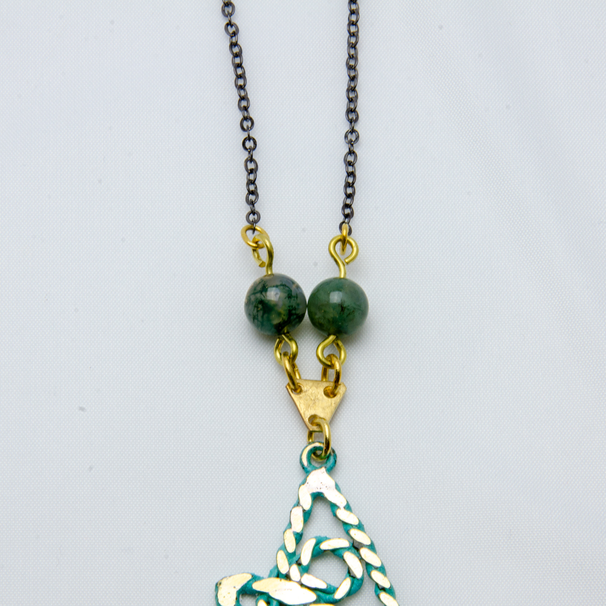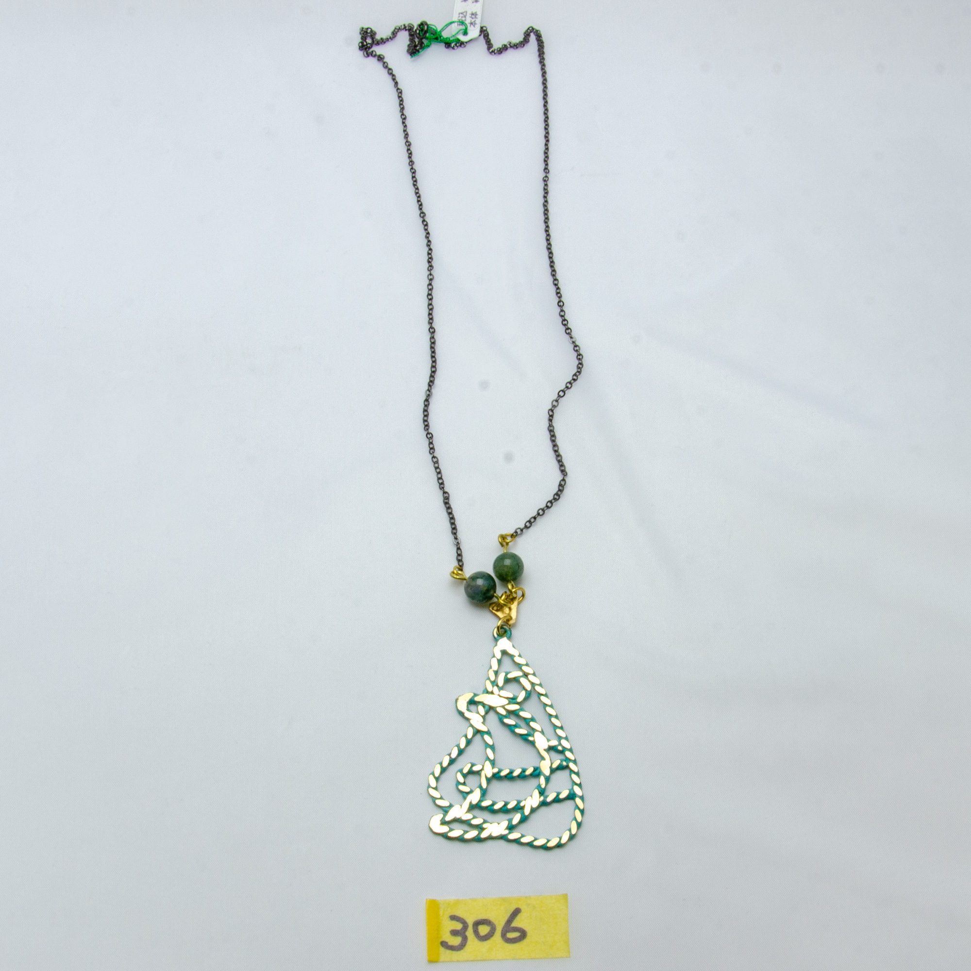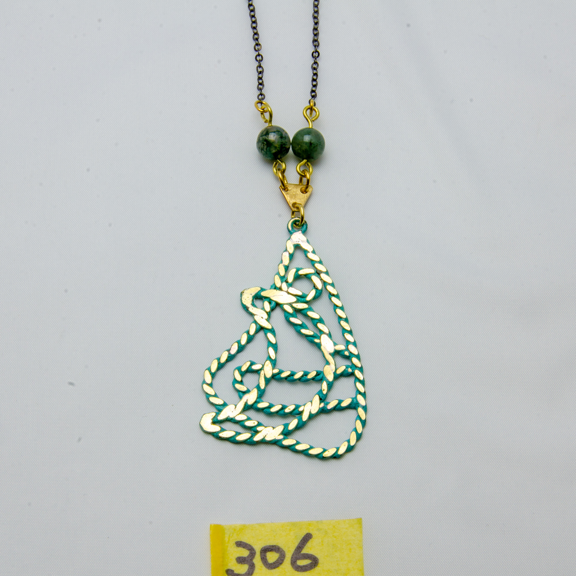 真鍮の表面を緑青仕上げという技法で青く仕上げたペンダントです。トップの装飾が個性的なデザインです。