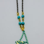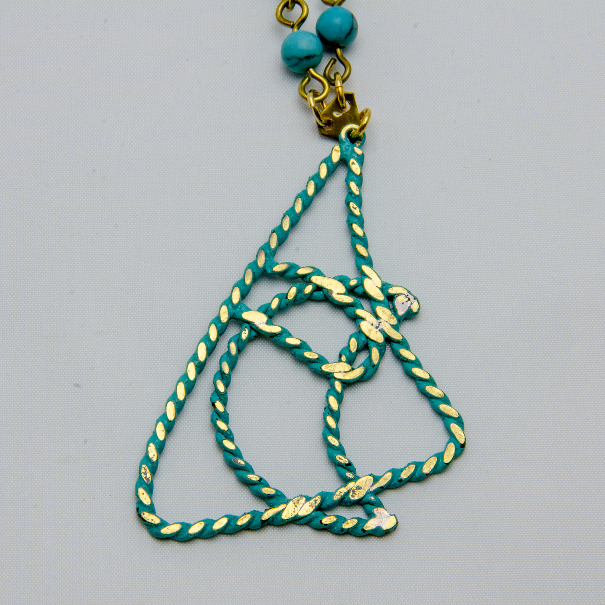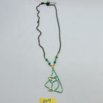 真鍮の表面を緑青仕上げという技法で青く仕上げたペンダントです。トップの装飾が個性的なデザインです。