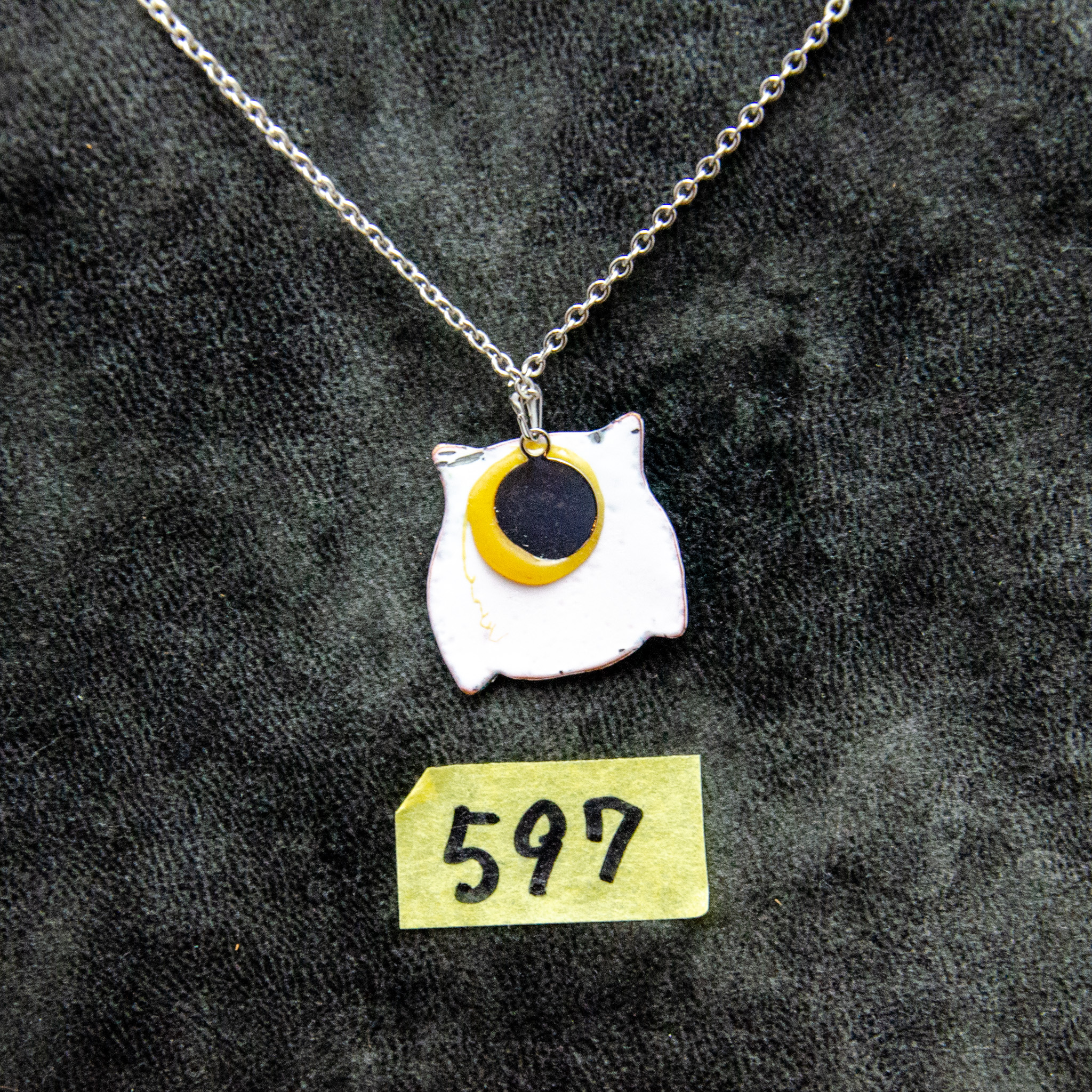 ちょっととぼけた表情が愛嬌のあるシマフクロウのペンダントです。七宝ならではの鮮やかな色が綺麗に出ています。