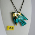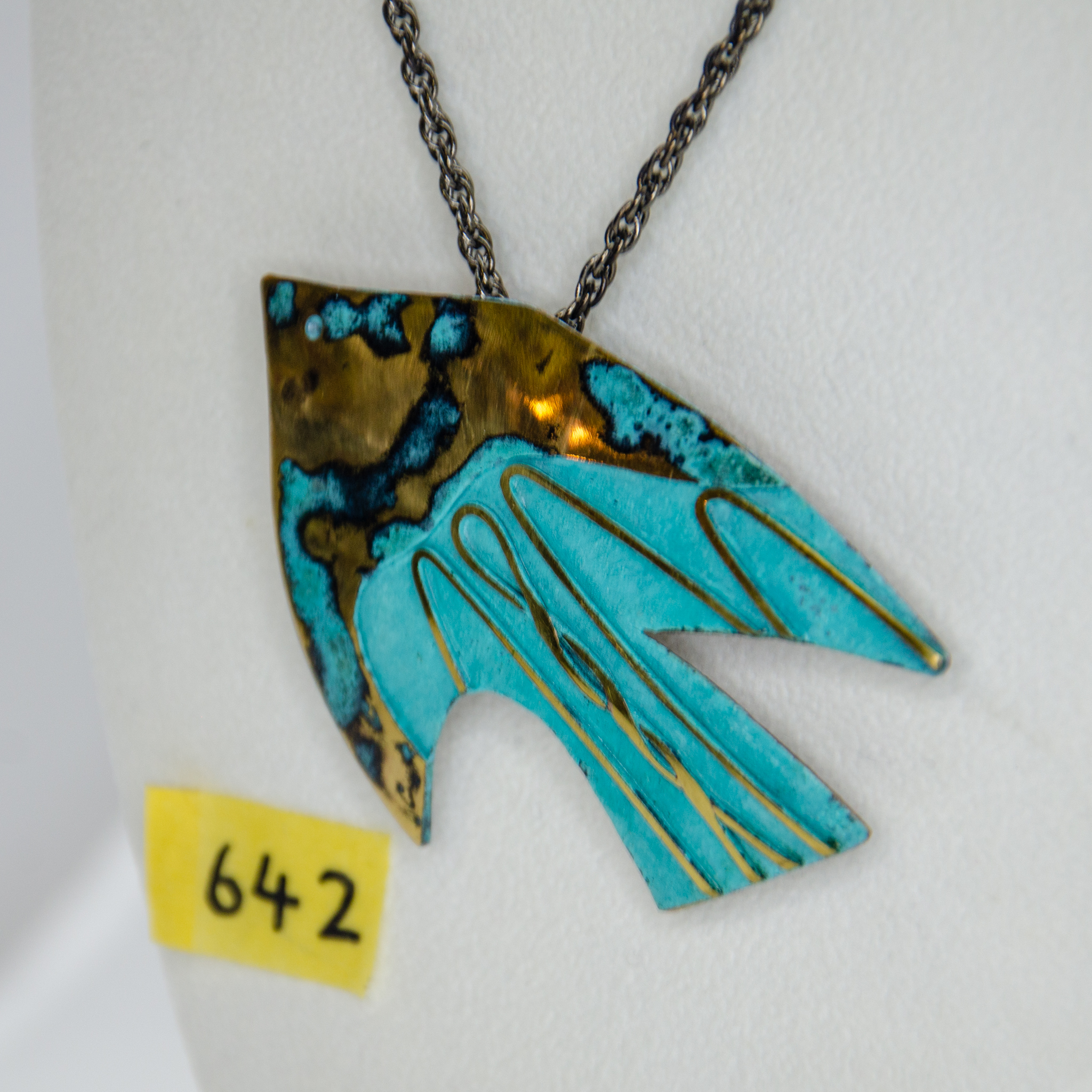 緑青の青さと大きく羽ばたく鳥の形が印象的なペンダントです。